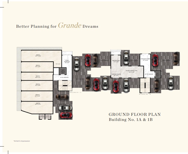 Commercial shops with stilt parking, lobby areas, and utility spaces